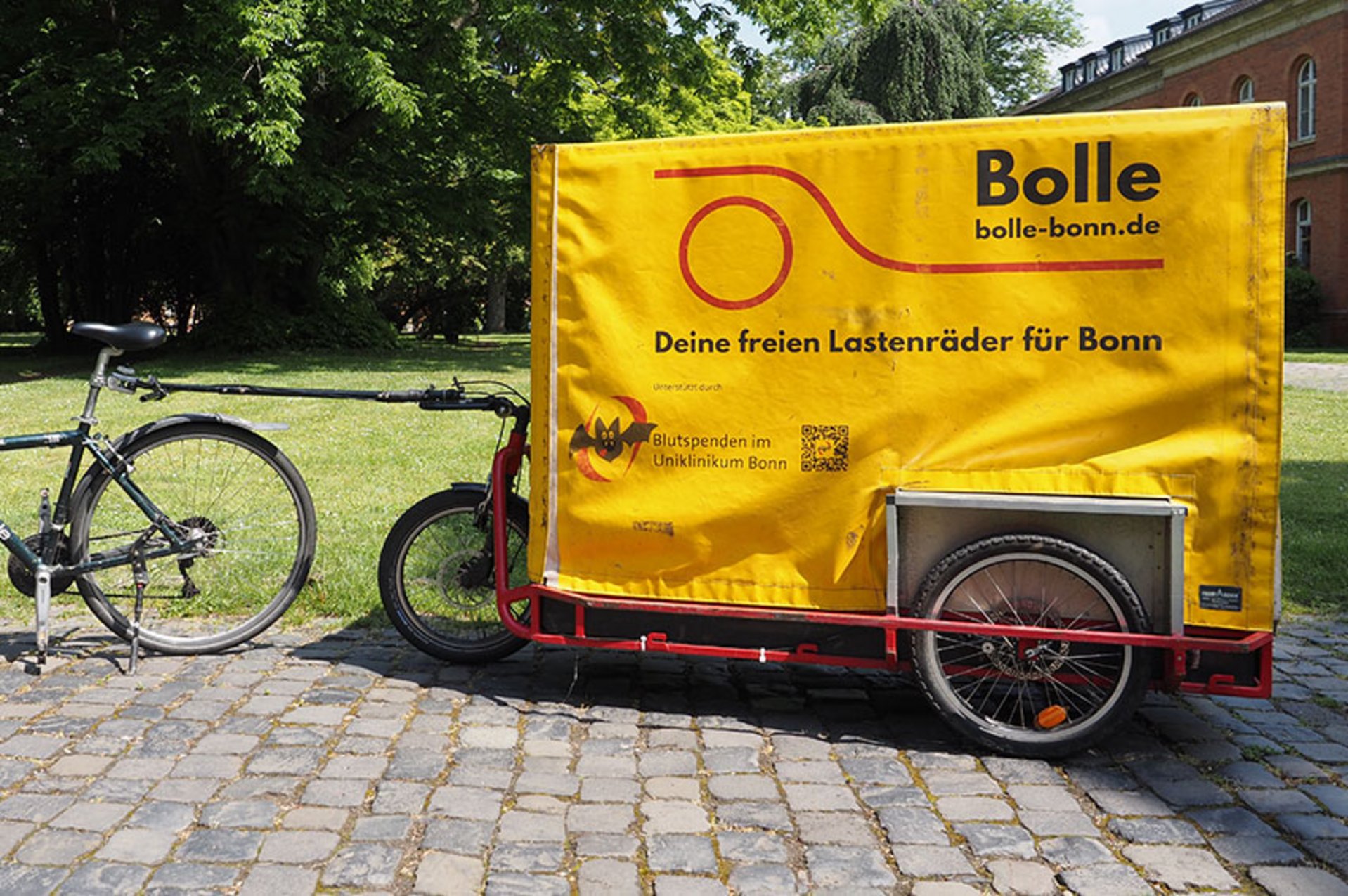 Leihe Dir ein Lastenfahrrad über Bolle Bonn, um umweltfreundlich größere Gegenstände in der Stadt zu transportieren. Die Ausleihe ist kostenlos, eine Spende hilft jedoch, das Angebot aufrechtzuerhalten.